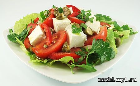 На 4 порции: 6 помидоров «дамские пальчики», порезанных на дольки, 1 кочан зеленого салата, порванного на кусочки, 1 огурец, порезанный, 1 маленькая луковица, порезанная, 1 красный чили, порезанный пополам, очищенный и порезанный, 20 черных маслин, 200 г сыра фета (или брынзы), покрошенного. Заправка: 2 ст. л. бальзамического уксуса, 5 ст. л. оливкового масла, 1 ст. л. орегано. Разложить помидоры, салат, огурец, лук, чили и оливки на большом блюде. Посыпать сыром. Для заправки, соединить все ингредиенты и побрызгать салат перед тем, как подавать. | |